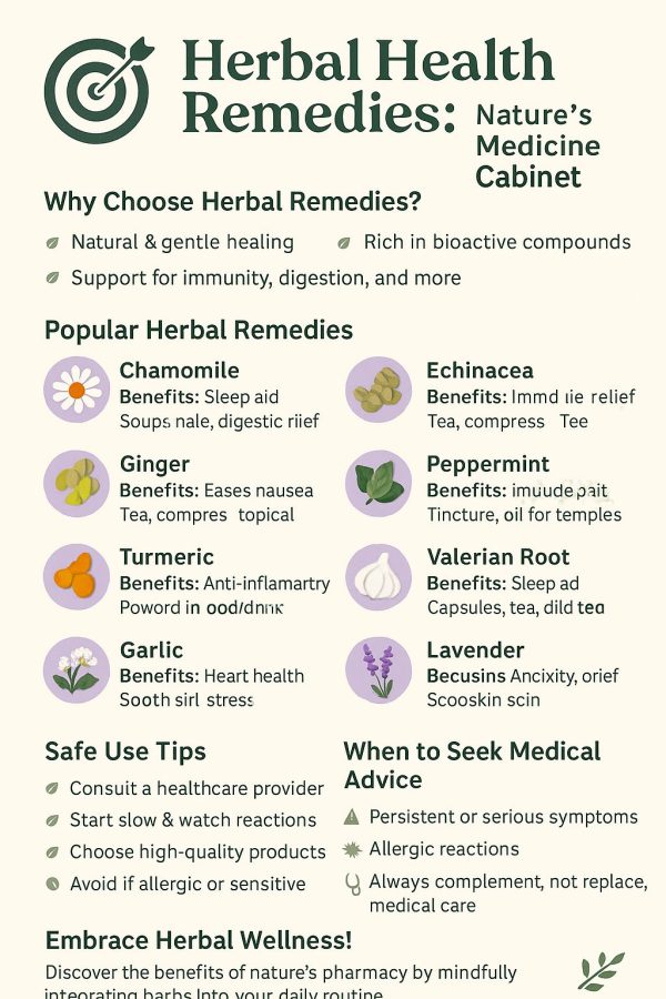 Herbal remedies offer a natural and time-tested way to support your health. From calming chamomile to powerful turmeric, these plants provide a wealth of benefits that can enhance well-being when used wisely. By integrating herbal health remedies into your daily life—with care and mindfulness—you can tap into nature’s pharmacy and enjoy a holistic approach to health.