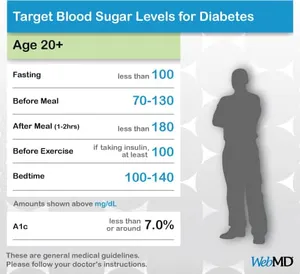 Blood Sugar Target: 2 hours after the start of a meal: Under 180 mg/dL.