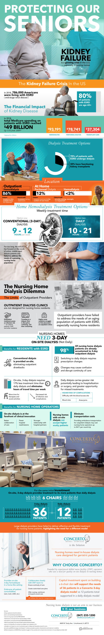 Concerto Renal Services help nursing homes deliver in-house dialysis care designed for geriatric patients by providing 3-day on-site hemodialysis in a comfortable setting while embracing all patient comorbidities. Kidney disease has had a significant impact on patients living in nursing homes, but being open to a different model that can deliver flexible treatment to such patients can protect the ones we love.