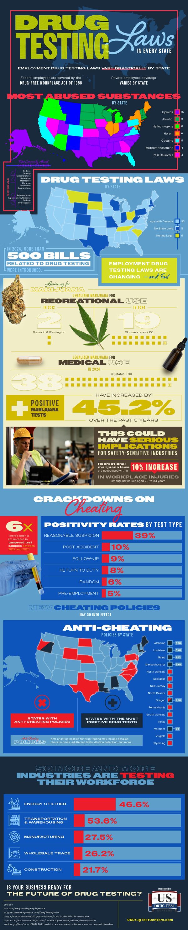 Currently, drug testing laws vary by state for private employees, although federal employees are covered by the Drug Free Workplace Act of 1988.  When it comes to drug testing laws for private employees, 35 states allow for testing with caveats.  5 states allow for testing without caveats, and 11 states do not have drug testing laws.  However, these laws are bound to continue to change; in 2024 alone, more than 500 measures regarding drug testing were introduced.