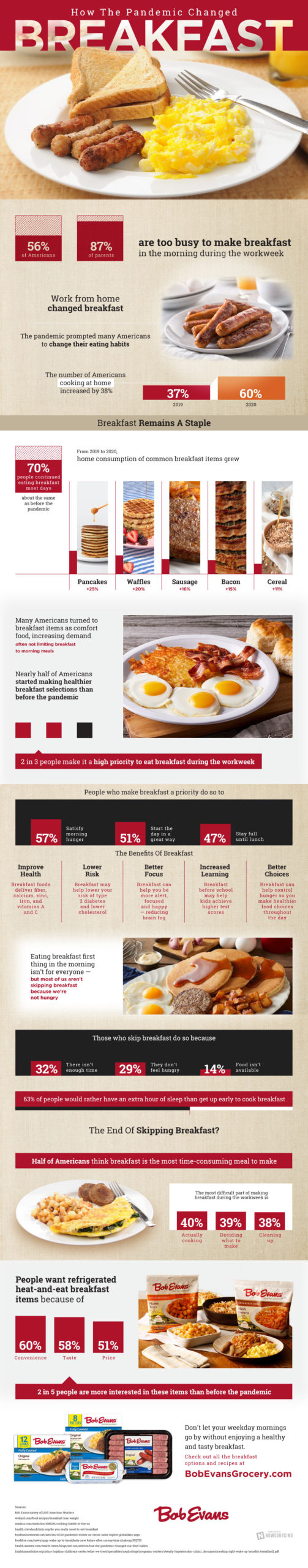 The pandemic has allowed millions of Americans to work from home for the first time. This new approach to work has changed the way many people live their lives. For one, more people are eating breakfast. Eliminating a morning commute freed up a large chunk of time for remote workers, allowing the percentage of people who cook at home to increase by 38%. From 2019 to 2020, home consumption of common breakfast items grew. Pancakes saw the most dramatic increase, up 25% from the past year. 2 in 3 people now make it a high priority to eat breakfast during the workweek.