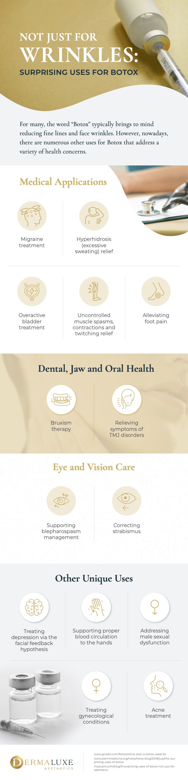 Botox, traditionally known for its cosmetic use in reducing wrinkles, has a surprising range of medical applications beyond the beauty industry. Originally derived from the bacterium Clostridium botulinum, Botox (botulinum toxin) works by temporarily paralyzing muscles, which has proven beneficial in various therapeutic contexts. It is used to treat chronic migraines, providing relief where conventional treatments fail. Additionally, Botox has been effective in managing severe underarm sweating (hyperhidrosis), offering a solution for those unresponsive to antiperspirants. It also aids in the treatment of overactive bladder by reducing muscle contractions, and in spasticity conditions like cerebral palsy, it helps ease muscle stiffness. Moreover, Botox is employed in the management of certain eye disorders, such as strabismus (crossed eyes) and blepharospasm (uncontrollable blinking). These diverse applications underscore Botox’s versatility, transforming it into a critical tool in modern medicine.